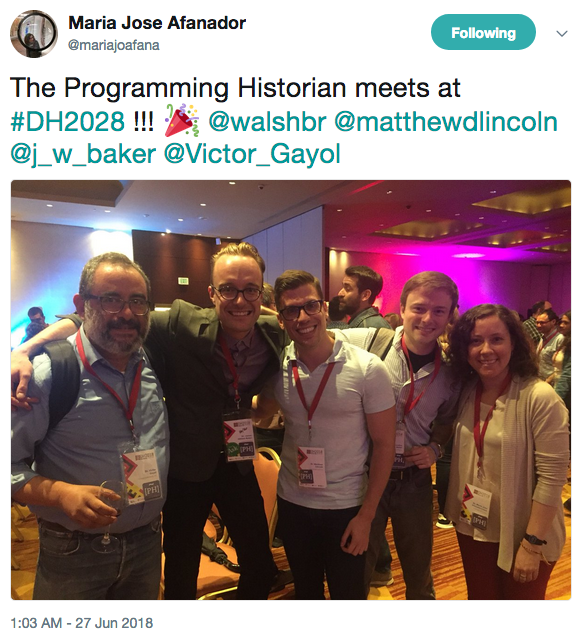 PH Blog The Programming Historian blog is our space to share news about the project, ideas for how you might use technology in your work, and exciting examples of the Programming Historian applied in the real world. Subscribe to the RSS feed for new blog posts. July 13, 2018 Programming Historian French-speaking initiative Anna-Maria Sichani Marie Puren and Sofia Papastamkou have joined the Programming Historian July 9, 2018 The Programming Historian in DH2018 Maria José Afanador-Llach and James Baker Members of the Programming Historian project team at DH2018 June 3, 2018 The Seven More Lessons No One's Yet Written (but need writing) Adam Crymble The Programming Historian Needs YOU...to help historians digitally analyse! May 24, 2018 Anna-Maria Sichani joins Project Team Antonio Rojas Castro Anna-Maria Sichani has joined the Programming Historian May 22, 2018 Uses of the Programming Historian Adam Crymble If you’re looking for inspiration into how you can use the Programming Historian in your work, look no further. We’ve put together a list of some of the examples we’ve come across over the years. We’re sure it’s no where near complete, but it’s great to see the hard work of our authors, reviewers, and team translating into real impact in a range of settings. April 16, 2018 The Programming Historian 2018 Community Survey Anandi Silva Knuppel To participate in Programming Historian 2018 Community Survey, follow this link to a Google Form: https://goo.gl/forms/2M8AbAiwgmGrD7MI3. The survey should take only a few minutes to complete and will close July 15, 2018. April 12, 2018 Convocatoria para taller de Escritura en Humanidades Digitales para América Latina Maria José Afanador-Llach and Adam Crymble The Programming Historian en español invita a la comunidad académica hispanohablante a participar en el taller Escritura en Humanidades Digitales para América Latina que se llevará a cabo en la Universidad de los Andes (Bogotá, Colombia) del 1 al 3 de agosto de 2018. El objetivo del taller es reunir a un grupo diverso de investigadores en distintas áreas de las humanidades para escribir tutoriales sobre metodologías en humanidades digitales, abordando específicamente necesidades de investigación en América Latina y el mundo hispano. Durante el taller se facilitará la producción de los primeros tutoriales originales en español para ser compartidos con una audiencia global. ← 13 / 19 →