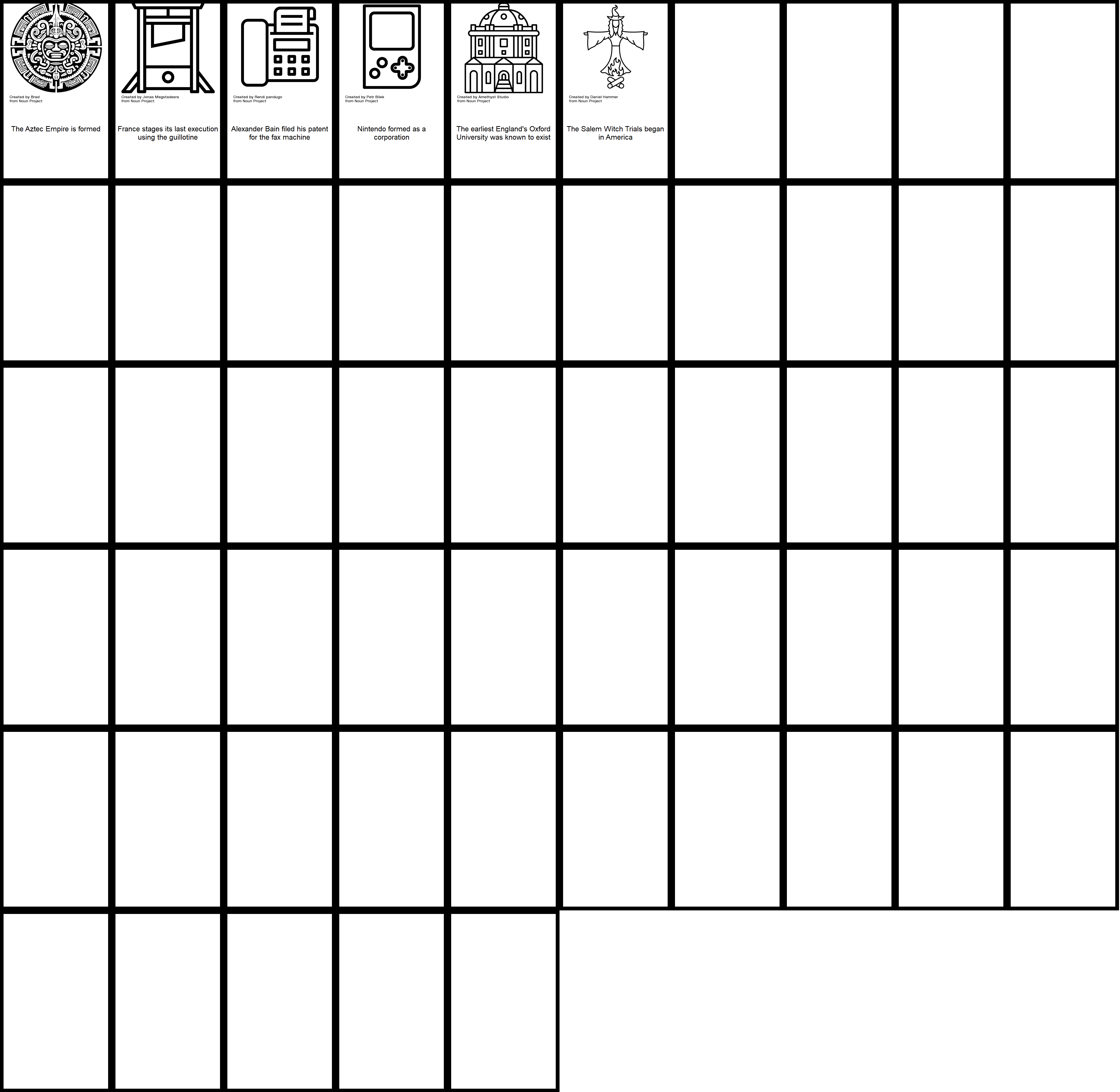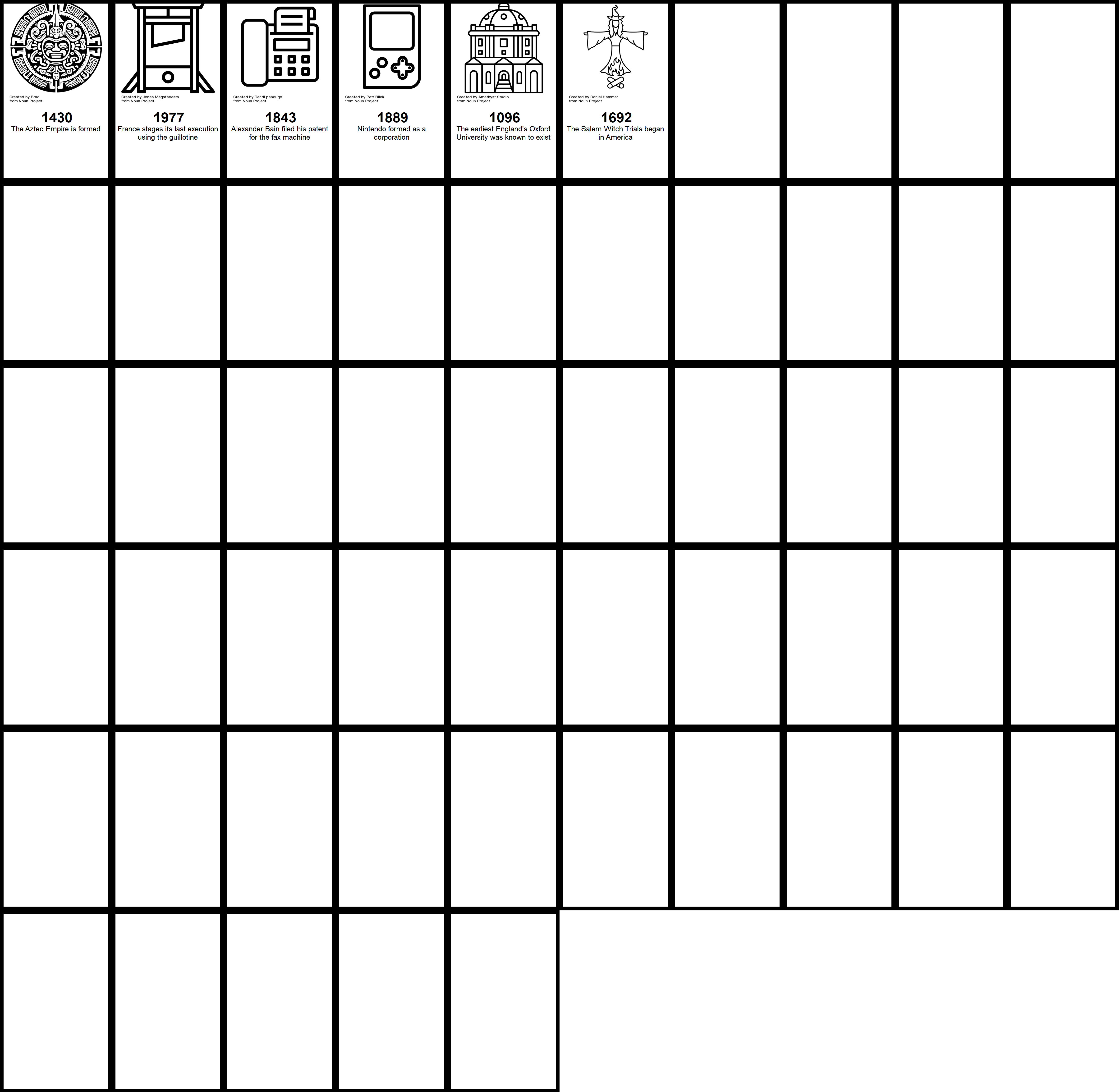 This lesson will hopefully facilitate history students and/or beginner game designers to create and generate their own variations of Timeline, perhaps opting to cover a specific theme or aspect of history, and share their work with others. These decks could be combined, to intersperse (for example) local history with foreign history. Through this process, players will discover moments of synchronology and historical overlap that can surprise and delight (did you know that Oxford University is older than the Aztec Empire?).