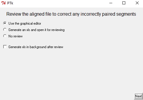 Para este proyecto utilizaremos la herramienta de LF Aligner, por lo que debemos escoger la primera opción y presionar next (siguiente).