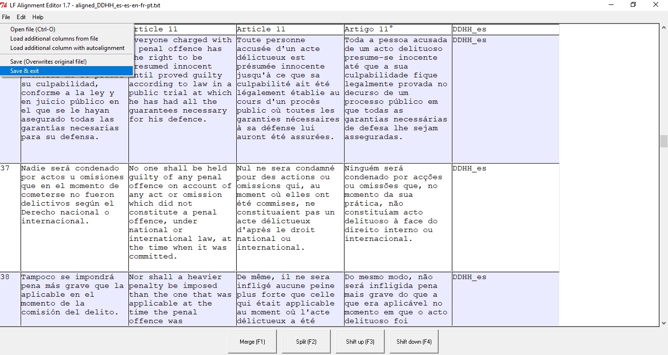 También puedes guardar, por separado, las versiones recién alineadas en documentos de texto plano (txt) y usar un visualizador sencillo de traducciones paralelas como AntPConc.