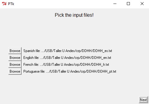 Del mismo modo, debemos especificar cuál será el texto principal o de partida que servirá como eje para el cotejo. Sin embargo, puedes cambiar el orden de las lenguas, si así lo deseas, luego de alinear los textos. Si trabajas con muchas lenguas y quieres cotejar traducciones respecto de una lengua en específico, colocar el texto fuente en una posición central (y no a la extrema izquierda) podría ser útil. De momento, posicionaremos el texto en español en la primera columna de nuestro bitexto. En la opción Language 1 (lengua 1) cambiaremos la lengua a español (Spanish). Debemos hacer lo mismo con las lenguas 2 (English), 3 (French) y 4 (Portuguese). Una vez lista esta configuración, presiona el botón next (siguiente).