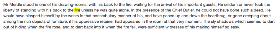 Let’s start with a simple concordance of fire in Dickens’s novels in CLiC. This gives us an overview of how the word is used: see Concordance 1. (Fireplace is, curiously, much less frequent and used in a different way!)